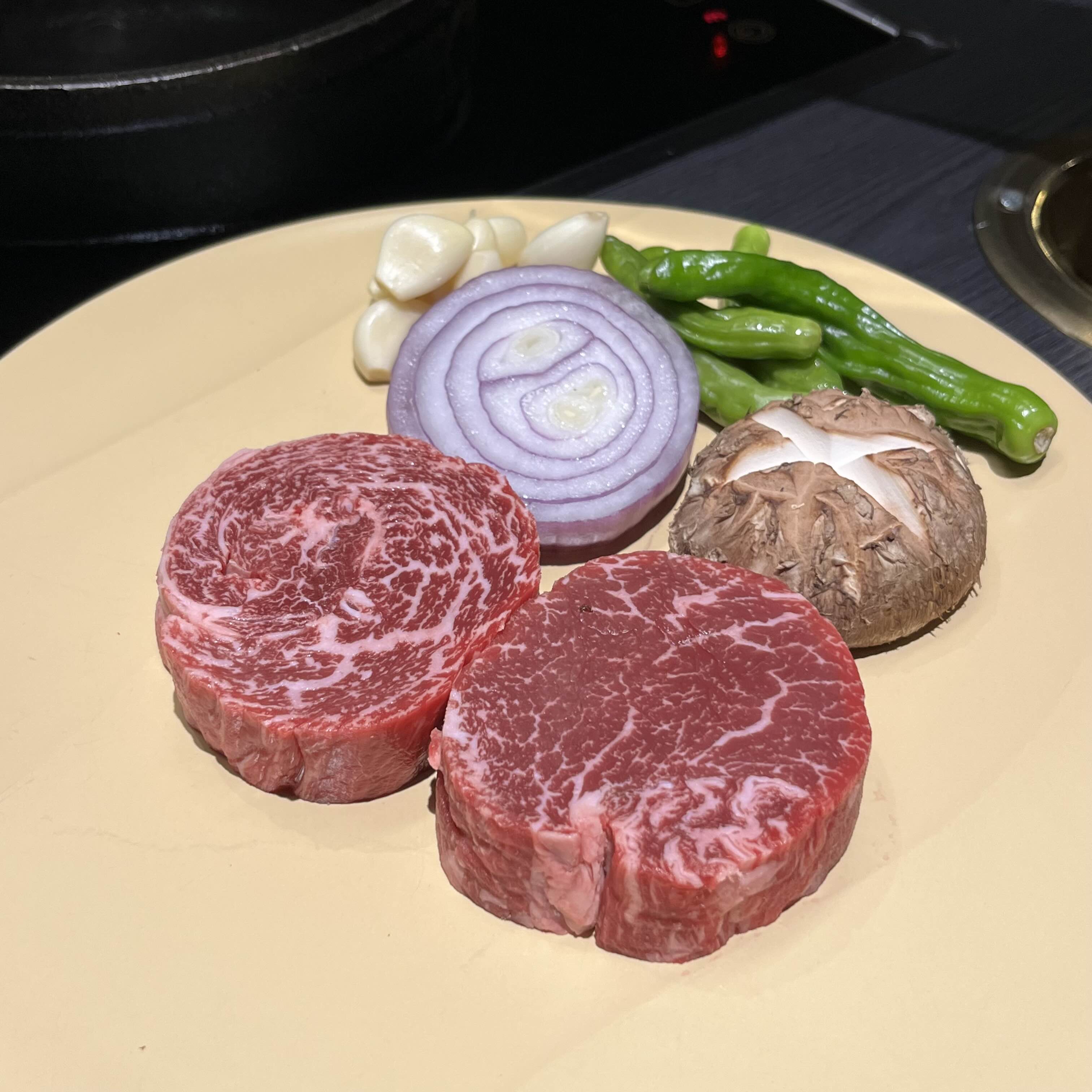 안심이랑 새우등심 시켰는데, 지방이 적어 보이는 오른쪽이 안심이고 새우등심은 먹어보고 싶어서 시켜봄
