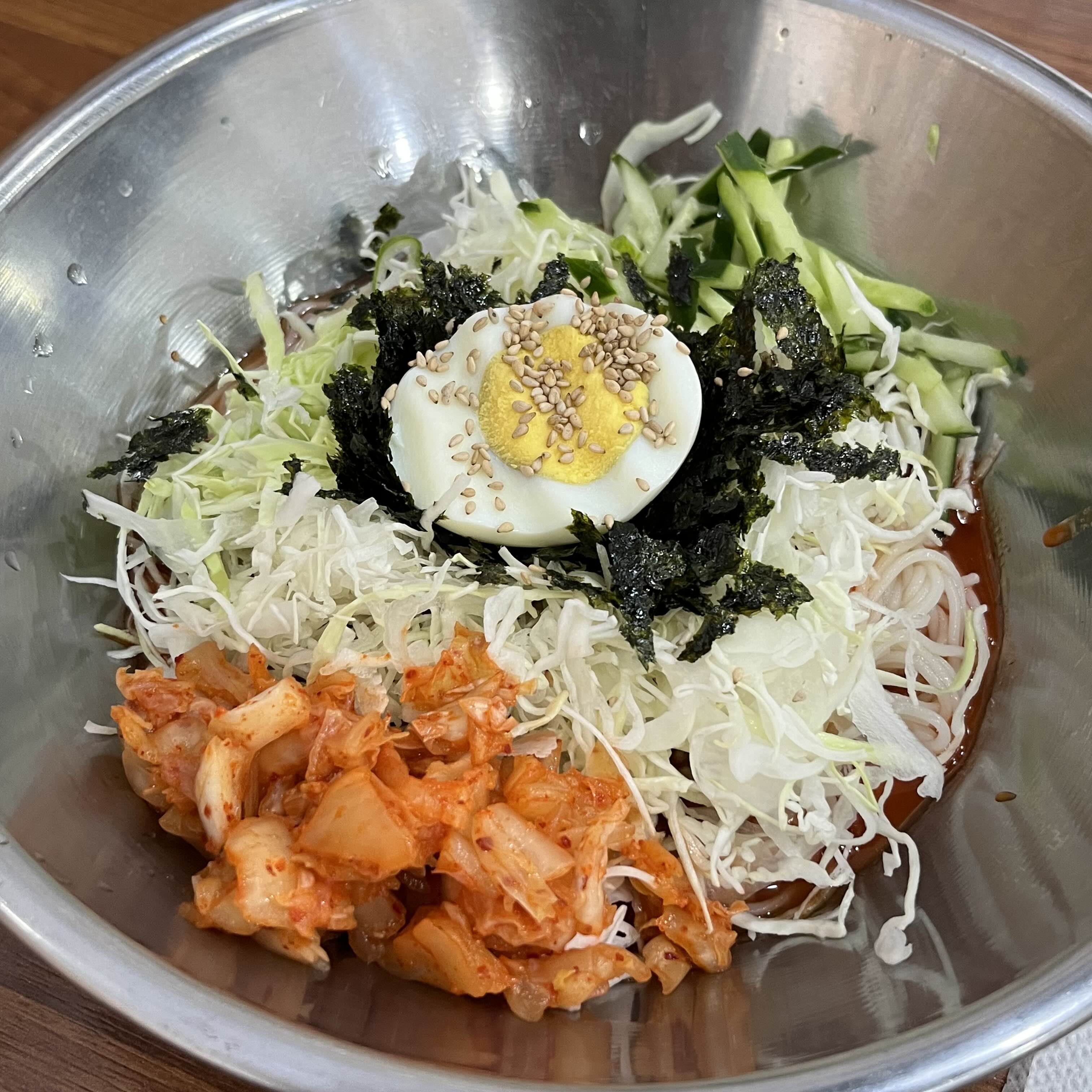 기본적으로 김치가 들어가서 새콤하고 양배추, 김, 채썬 오이가 들어가있다 날씨가 좀 추워서 그랬는지 차가운 비빔국수는 그렇게 손이 가진 않았다ㅎㅎ 하지만 양념도 맛있고 국수 삶은 정도도 아주 딱이었다